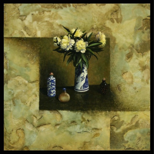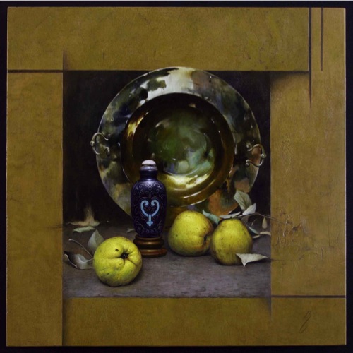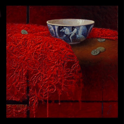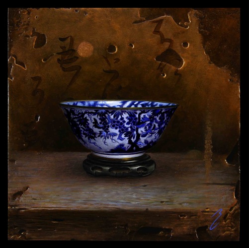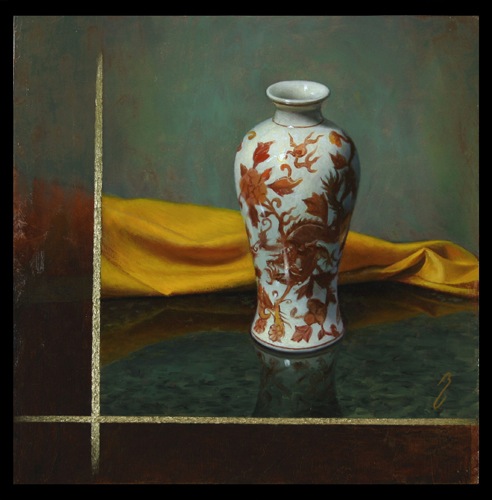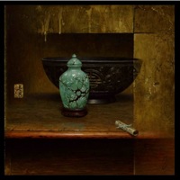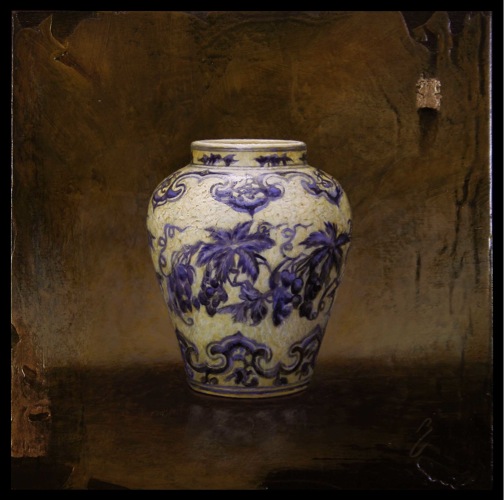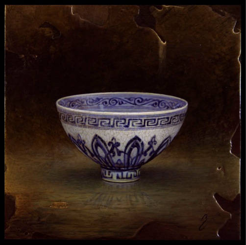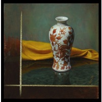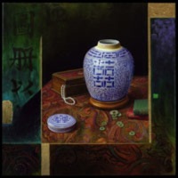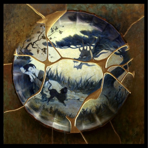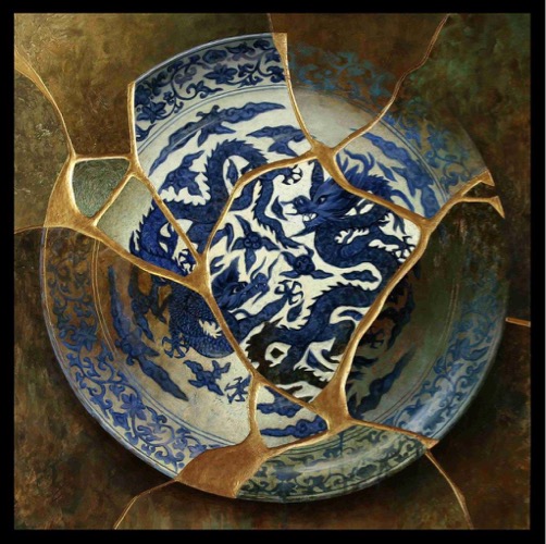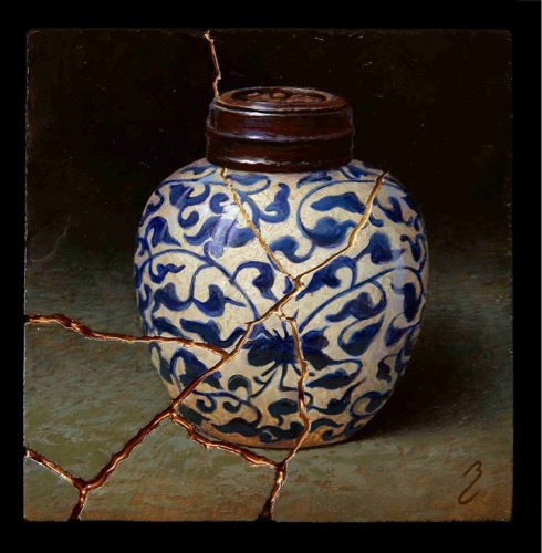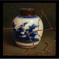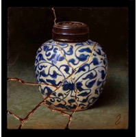 In Capolongo's latest series titled; Kintsugi, the artist continues to work with elegant Asian pottery, especially of the Ming and Qing dynasties; but now entering into the mix is the art of kintsugi, or kintsukuroi. This is the Japanese art of mending broken pottery with gold or other precious metals. Rather than attempting to deny or disguise the breakage, it is accented, and becomes part of the object's history. As in the Japanese philosophy of wabi-sabi, there is an embracing of the flawed or imperfect. In hi-lighting the cracks and repairs it is not brokenness that is celebrated, but redemption. Hence, the symbolism in the art of kintsugi is a great metaphor for finding healing and wholeness through adversity.