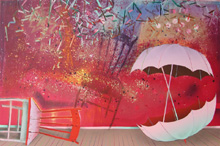 Ruminski takes inspiration from the simplest lines and forms in children's drawings; the pure intuition and the "scribbles" describing their world. Her sophisticated colours and textures mix with straight lines and flowing curves, forming paintings of beauty. Ruminski invites the viewer to find humour in serious statements, and a have sense of child's play with her work. Image: |